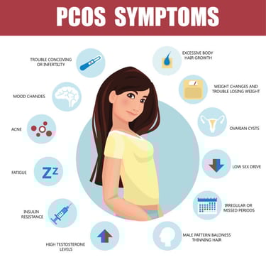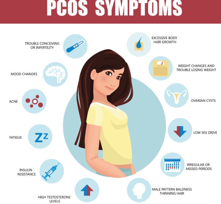 متلازمة تكيس المبيض قد تسبب مجموعة من الأعراض، تختلف حسب الحالة الفردية. بعض الأعراض الشائعة هي: